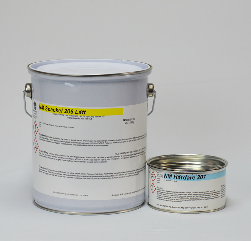 NM Spackel 206 Lätt är ett lösningsmedelsfritt tvåkomponent epoxispackel.