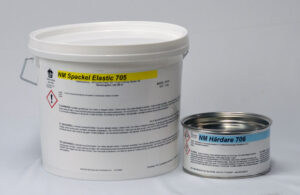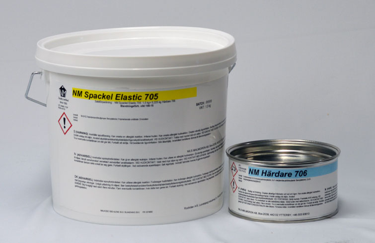 Spacklet är från början flytande men efter sammanblandning med härdaren, NM Härdare 705, bildas ett mycket tixotropt spackel som inte rinner på vertikala ytor.